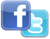 There’s a widget for showing a Facebook Like Box and also one for Twitter, which I believe displays your latest few tweets (I have’t tried it). If you want to use these though, you’ll need a widget area — usually a sidebar. I noticed your pages are set to full width, so you have no widget area at the moment.